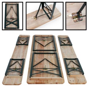 Die klassische Bierzeltgarnitur besteht aus 2 Holzbänken und 1 Holztisch und ist spielend leicht durch den Einsatz des 2-Fuß-Systems beim Tisch und den Bänken auf- und wiederabbaubar.